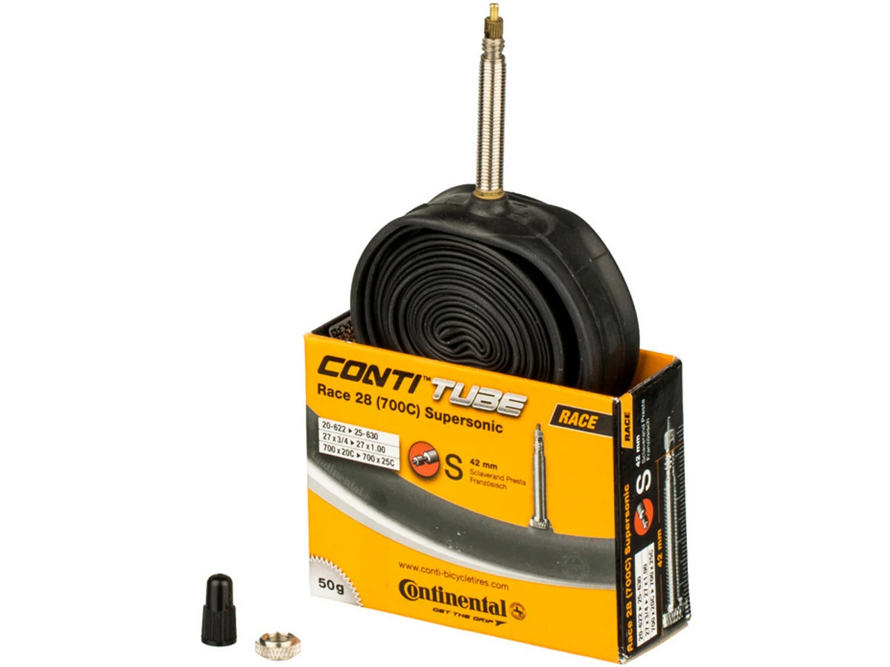 Bezeichnungen/Synonyme: Sclaverand-Ventil (SV), Französisches Ventil, Presta-VentilAußendurchmesser: 6,5 mmSonstiges: Bei allen Continental-Schläuchen mit SV-Ventil ist das Ventil abschraubbar (Ventilverlängerung, Befüllen mit Antiplatt-Mitteln etc.).Lieferumfang:1 x Schlauch Continental Race 28 Supersonic