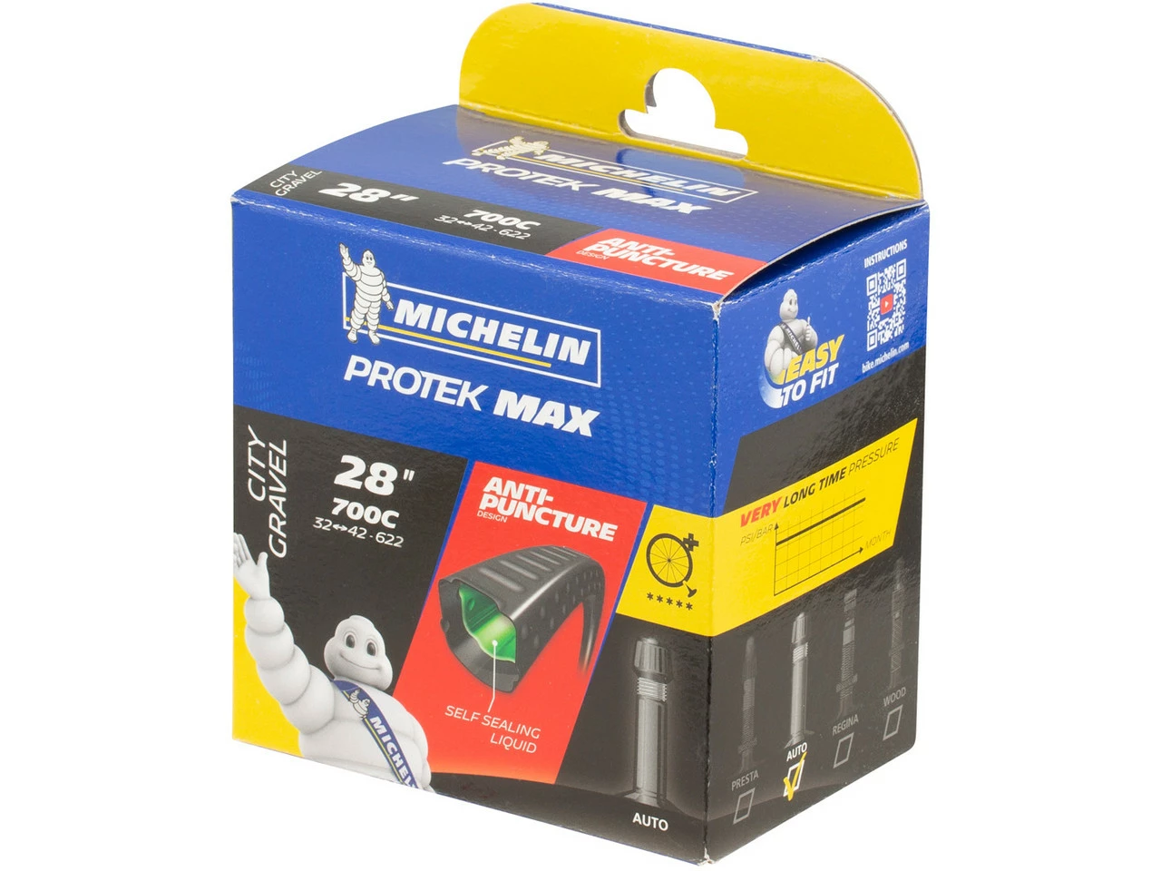 Innovativer Fahrradschlauch Protek Max A3 für 28″ von Michelin mit viereckiger Form und integrierter Pannenmilch für die ultimative Pannensicherheit.