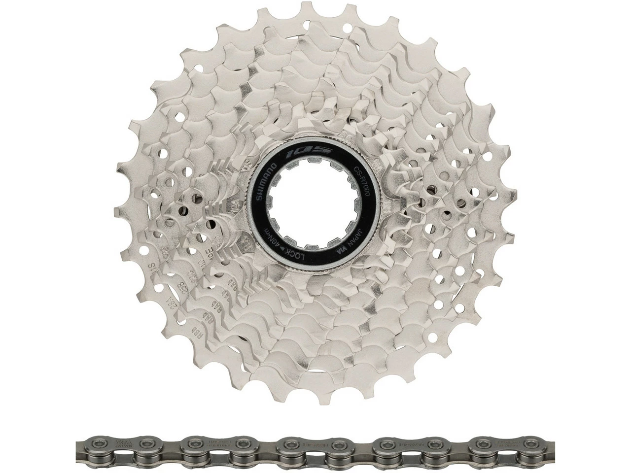 1 x Kurbelgarnitur Shimano 105 (FC-R7000)1 x Schaltwerk Shimano 105 (RD-R7000)1 x Umwerfer Shimano 105 (FD-R7000)1 x Kassette Shimano 105 (CS-R7000)1 x Kette Shimano 105 / SLX Quick-Link (CN-HG601-11)2 x Scheibenbremse Shimano 105 BR-R7070 + ST-R7020, VR und HR1 x Bremsleitung Shimano SM-BH90-JK-SS 1000 mm (VR)1 x Bremsleitung Shimano SM-BH90-JK-SS 1700 mm (HR)2 Paar Bremsbeläge Shimano1 x Scheibenbremsadapter für VR 140/160 + 160/180 mm2 x Leitungsanschlussset mit Oliven und Insertpins2 x Befestigungsschraube Typ A (für VR)2 x Befestigungsschraube für 25 mm Rahmendurchmesser (HR)1 x Kurbelschraube Shimano1 x Außenhülle Shimano OT-RS900 240 mm1 x Endkappe verlängert für Schaltwerk1 x Kassetten-Abschlussring Shimano Stahl1 x Kettenschloss Shimano SM-CN900-11 Quick-Link1 x Schaltzug 1800 mm1 x Schaltzug 2200 mm3 x Schaltzug-AußenhülleBremsenset montagefertig, befüllt, nach der Montage ist eine Entlüftung zu empfehlen