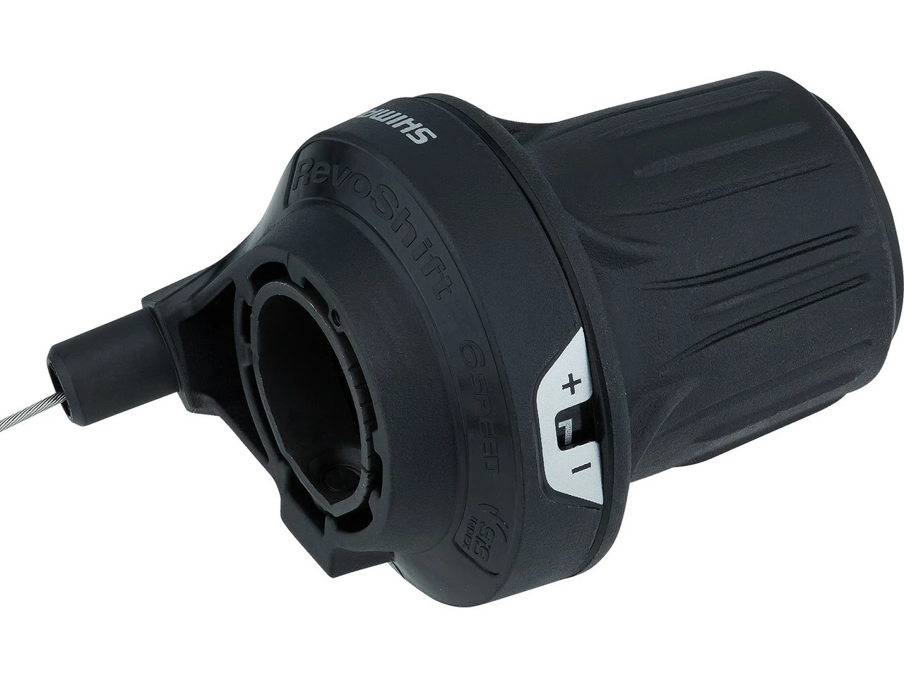 Shimano Revoshift-Schaltgriffe werden zum Schalten einfach zwischen Daumen und Zeigefinger gedreht, sodass der Lenker fest im Griff bleiben kann. Diese einfache, sichere Art des Schaltens kommt besonders Gelegenheitsfahrern und Kindern entgegen. Die gestufte Form des Drehschalters sorgt dafür, dass er sich unabhängig von der Handgröße problemlos betätigen lässt.