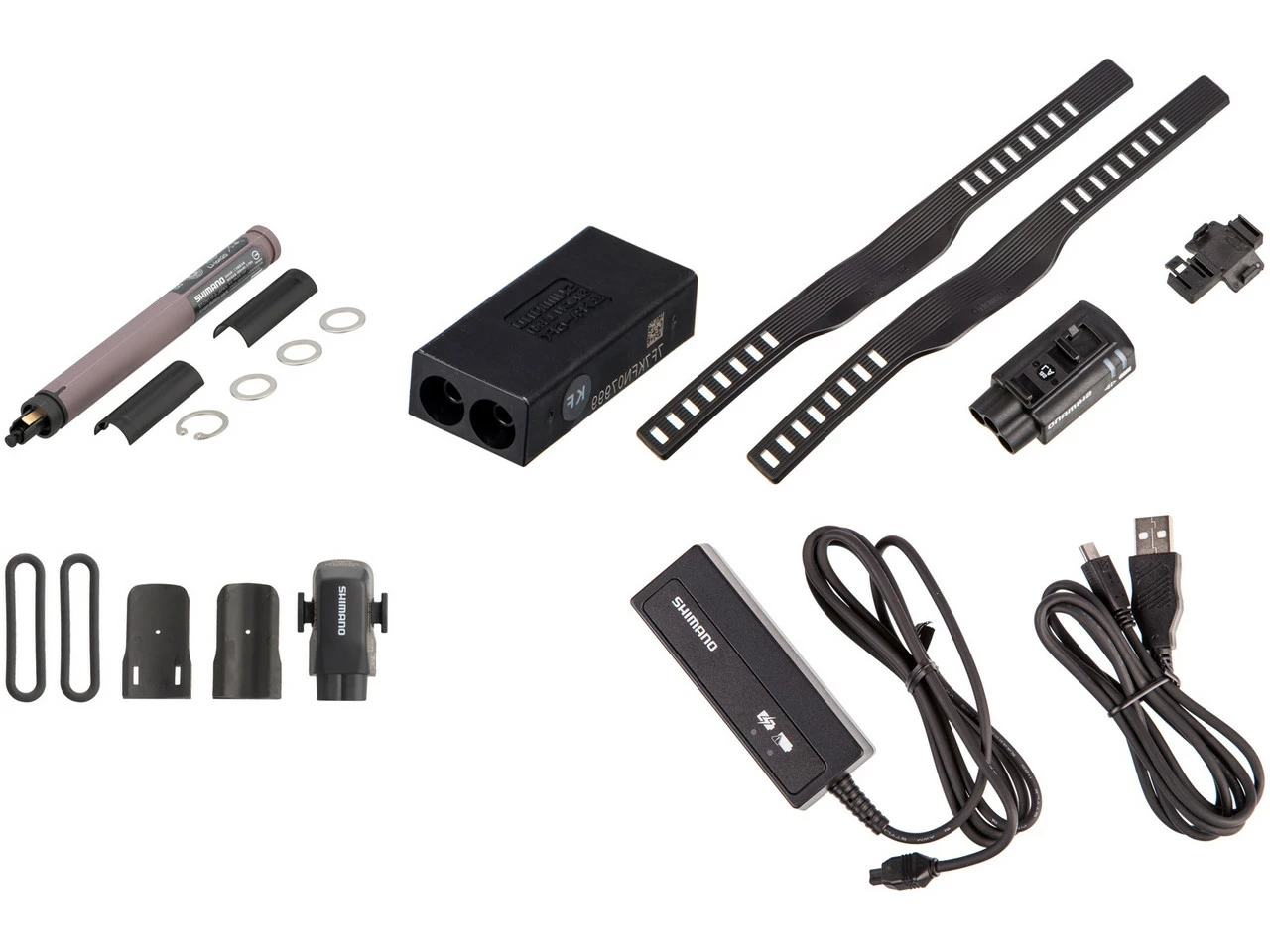 1 x Kassette Shimano XTR CS-M90011 x Schaltwerk Shimano XTR Di2 Shadow Plus (RD-M9050)1 x Kette Shimano XTR / Dura-Ace CN-HG901-111 x Schalter Shimano XTR Di2 (SW-M9050), rechts1 x Akku Shimano Di2 (BT-DN110)1 x Ladegerät Shimano Di2 (SM-BCR2)1 x Verteilerdose Shimano SM-JC41 intern1 x Elektrischer Verteiler Shimano 3 Port (SM-EW90-A, nur bei Version ohne Display)1 x Drahtlos-Einheit Shimano (EW-WU101, nur bei Version ohne Display)1 x Systeminformations-Display Shimano Di2 SC-M9051 (nur bei Version mit Display)1 x Kassetten-Abschlussring Shimano Aluminium1 x Kettenschloss Shimano SM-CN900-11 Quick-Link1 x Steckerwerkzeug Shimano TL-EW021 x Ladekabel Shimano USB Y-7FJ000201 x Befestigungsmaterial für EW-WU101 (nur bei Version ohne Display)2 x Lenkerschellen-Adapter (nur bei Version mit Display)