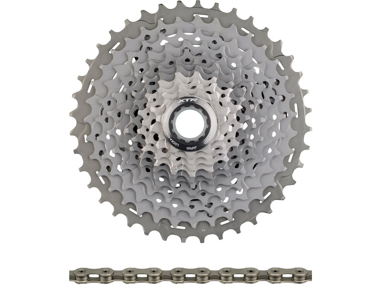 Spezifikationen:Serie:XTR Di2 M9050Einsatzbereich:Cross Country, All Mountain, EnduroSchaltung:11-fach (elektrisch)Kabelverlegung:internAkku-Montage:internFunkprotokoll:ANT private, Bluetooth® LE (wireless/kabellos)Technische Daten Kassette:Typ:XTR CS-M9001 (HG)Schaltstufen:11-fachAbstufung:11-40 Z (11-13-15-17-19-21-24-27-31-35-40 Z)Material Ritzel:Stahl (Ritzel 1 bis 4), Titan (Ritzel 5 bis 10), Aluminium (Ritzel 11)Freilaufkompatibilität:Shimano MTBHinweis:mit 1,85 mm Distanzring kompatibel zu Shimano Road 11-fachSpider / Ritzelträger:4 (2 x Aluminium, 2 x Carbon)Technische Daten Schaltwerk:Typ:XTR Di2 RD-M9050 kurz/mittellang (GS)Befestigung:Standard (Direct Mount kompatibel)Kapazität:35 ZähneMax. Zähne größtes Ritzel:42 Zähne bei 2×11-fach, 46 Zähne bei 1×11-fachMin. Zähne größtes Ritzel:40 ZähneMax. Zähne kleinstes Ritzel:11 ZähneMin. Zähne kleinstes Ritzel:11 ZähneMax. Differenz vorne:10 ZähneKompatibilität:Shimano MTB 11-fachKompatible Kette:HG-X11Schalträdchen:11 ZähneMaterial äußerer Käfig:Carbon (CFRP)Material innerer Käfig:AluminiumMaterial weitere Bauteile:Edelstahl, Aluminium, Carbon (CFRP)Technische Daten Kette:Typ:XTR / Dura-Ace CN-HG901-11 (HG-X11)Gliederzahl:116Verschlussart:Kettenschloss (Quick-Link)Nietentyp:chrombeschichtet, hohlLaufrichtungsgebunden:JaMaterial:StahlTechnische Daten Schaltgriff:Typ:XTR Di2 SW-M9050 (Firebolt)Montage:Klemmschelle (geschlossen)Material Gehäuse:KunststoffMaterial Hebel:KunststoffEinstelloptionen:PositionseinstellungFeatures:2 Schalter, 1 E-Tube-Anschluss, Mehrfach-Input rechts: Hold, Mehrfach-Input links: kompatibel mit RD Multishift, Federung/Dämpfer Schalter: links Dämpfungskontrolle von FOX iRD Komponenten möglichTechnische Daten Display: nur bei Version mit Display