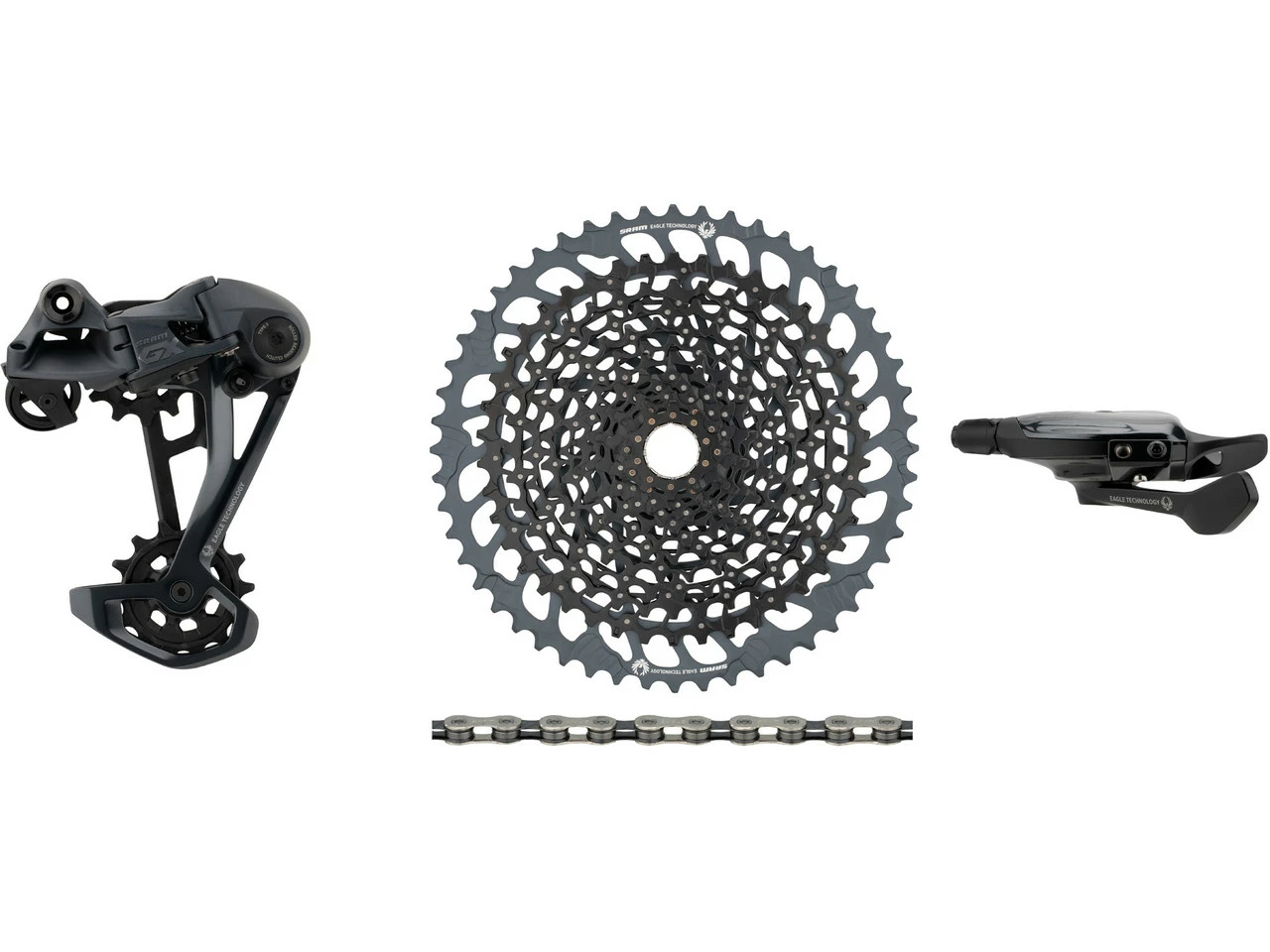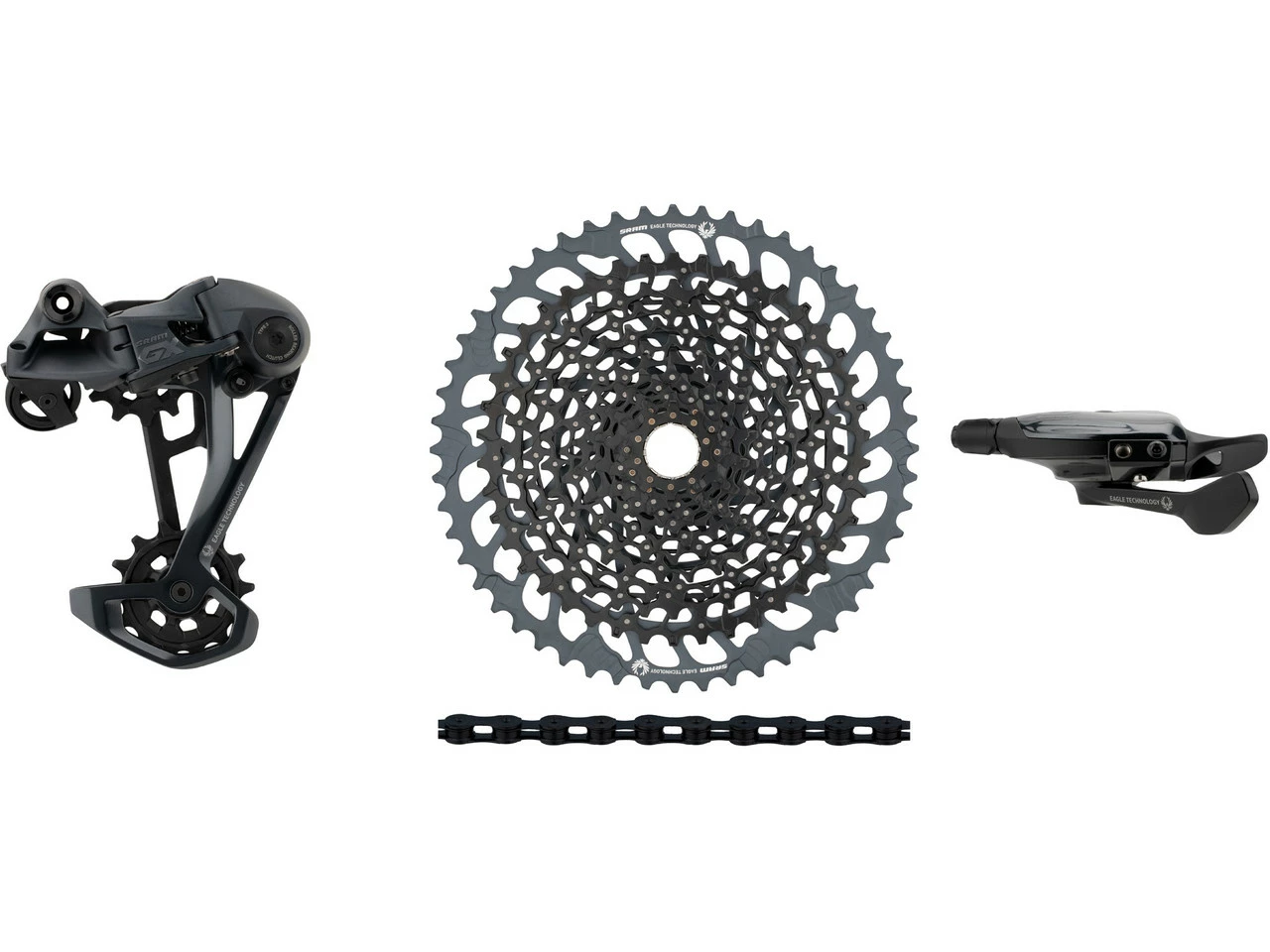 Dieses SRAM Upgrade-Kit der Serie GX Eagle für 1×12-fach-Antriebe hat die passende Kassette direkt dabei. Es setzt sich zusammen aus dem neuesten GX Eagle Schaltwerk, passendem GX Eagle Trigger Schaltgriff, einer XG-1275 Kassette sowie einer PC XX1 Eagle oder PC GX Eagle Kette.