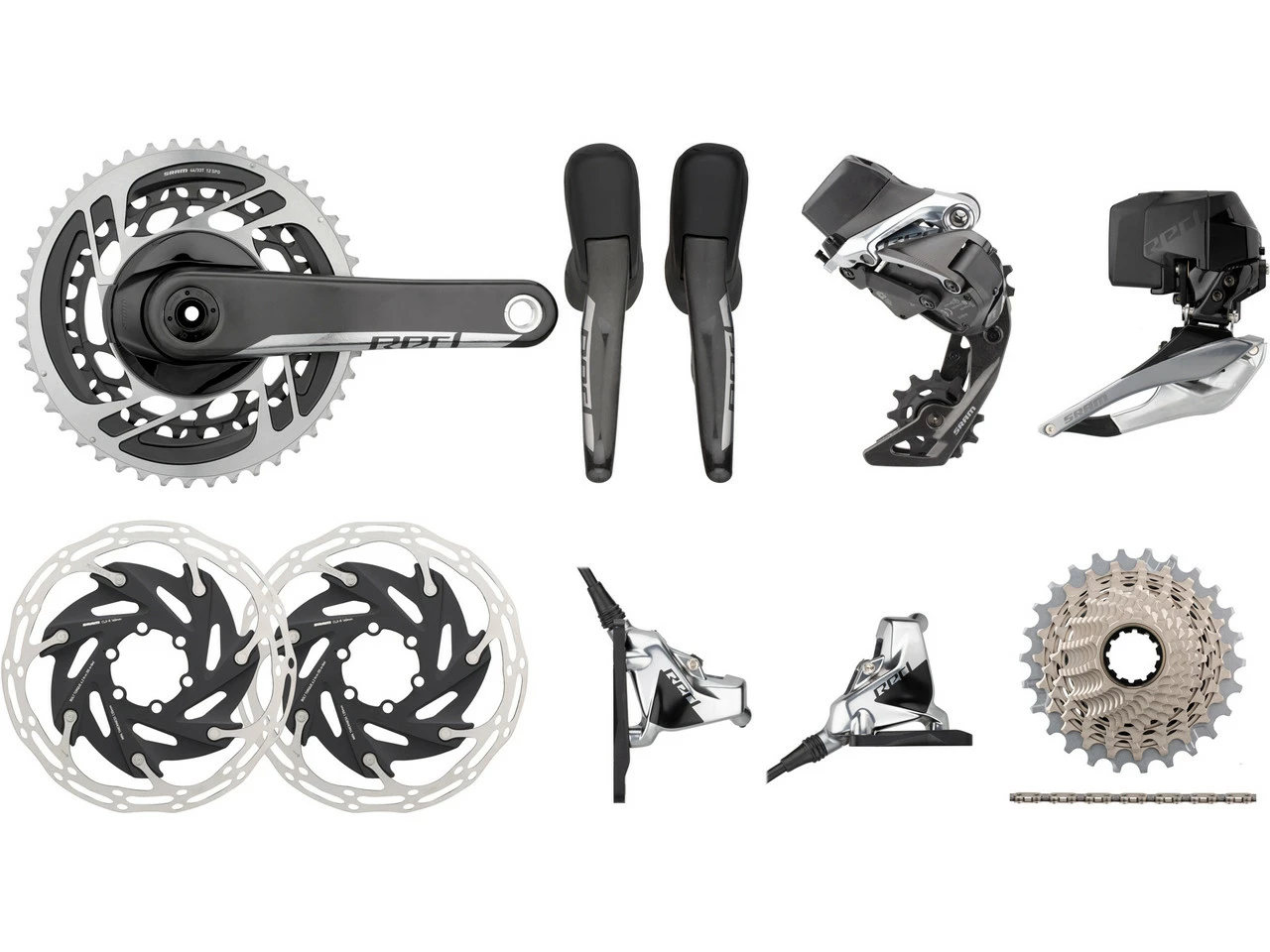 Lieferumfang:1 x Kurbelgarnitur SRAM Red DUB 2-fach AXS1 x Kassette SRAM XG-12901 x Kette SRAM Red 12-fach1 x Kettenschloss SRAM PowerLock1 Paar Schalt-/Bremsgriffe SRAM Red eTap AXS HRD FM1 Paar Scheibenbremsen SRA