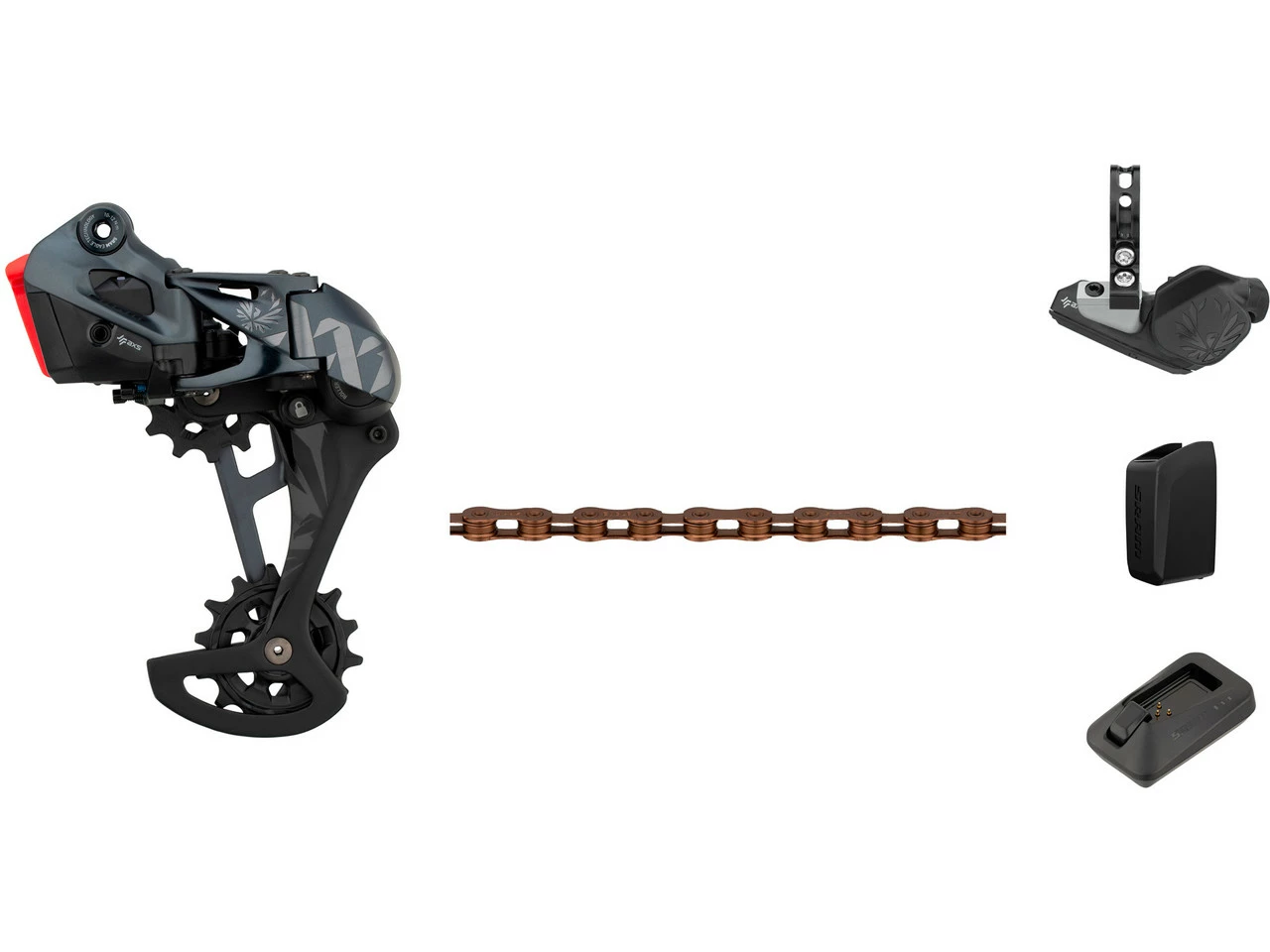 Schaltwerk:blackSchaltgriff:blackKette:nach Wahl XX1 rainbow (bunt), XX1 copper (kupferrot), XX1 gold, XX1 blackHerstellernummern:Schaltwerk: 00.7518.125.000Schaltgriff: 00.7018.397.000Akku: 00.3018.102.000Ladegerät: 00.3018.117.000Kette: 00.2518.039.010 (XX1 rainbow), 00.2518.043.010 (XX1 copper), 00.2518.024.020 (XX1 gold), 00.2518.024.021 (XX1 black)Lieferumfang:1 x Schaltwerk SRAM XX1 Eagle AXS1 x Controller Schaltgriff SRAM Eagle AXS 12-fach1 x Kette SRAM PC XX1 Eagle1 x Akku SRAM1 x Ladegerät SRAM1 x Kettenschloss SRAM PowerLock1 x Klemmschelle SRAM1 x Einstelllehre SRAM Chain Gap Adjustment Gauge